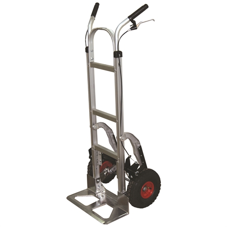 The ST250/FM aluminium sack truck comes equipped with brakes helping users to control loads more easily down a slope. It can accommodate loads up to 250 kg. The hand truck offers unmatched quality and features a structure made of reinforced aluminium.