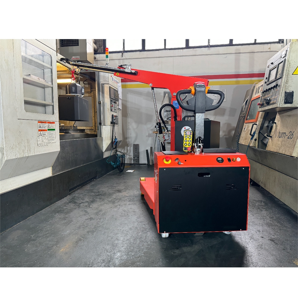 The SCP750DBR electric mobile crane lifts loads up to 750 kg and provides 270° mast rotation for handling in confined workshop areas. Its electric double jib and remote control ensure safe and precise positioning for internal industrial lifting operations.