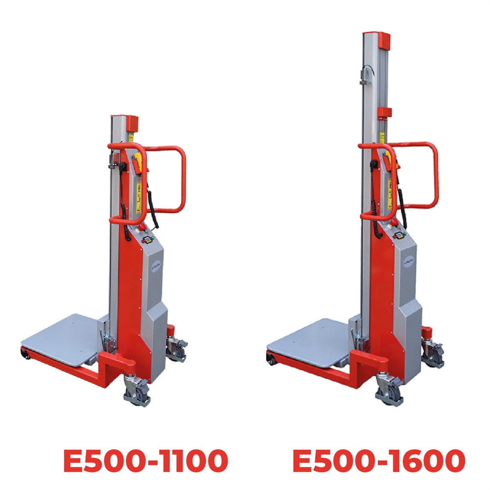 L’encombrement contenu facilite le travail dans des zones contraintes. La version E500-1100 propose une hauteur mini/maxi annoncée à 82/1100 mm, et la version E500-1600 à 82/1600 mm. La hauteur d’élévation utile est indiquée à 1018 mm ou 1518 mm selon la version. Ces valeurs orientent le choix selon l’altimétrie des postes, la hauteur d’un établi, d’une table de montage ou d’un niveau de transfert.