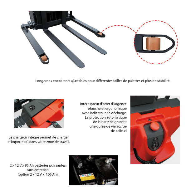• Longerons encadrants réglables pour une plus grande stabilité et pour manipuler tout type de palette
