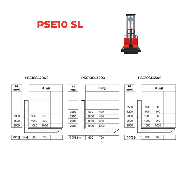 PRODUIT ARRÊTÉ. Les PSE10SL sont des gerbeurs électriques à conducteur accompagnant avec capacité nominale de 1 tonne et hauteurs de levage de 2900, 3200 et 3500 mm. Ils sont une solution idéale pour des applications légères.